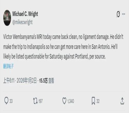 北京时间1月2日凌晨,据马刺随队记者Michael C. Wright报道,文班亚马没有随队前往印第安纳波利斯,而是留在圣安东尼奥接受进一步治疗,他确定缺席1月3日和步行者的比赛。MRI检查结果显示,文班亚马没有结构性的损伤。