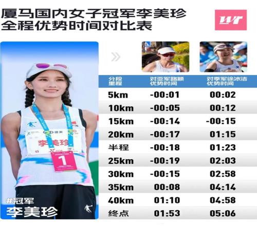河南选手路颖尽管也在自己的首次厦马中经历了被李美珍反超的时刻,但赛后的她非常坦然地接受着这个结果,她透露,赛前练得不太好的自己本想“跑哪儿算哪儿”,但被李美珍追上后,尝试跟对方2公里的路颖感受到了“腿上酸,发紧,发硬”,那时想着后面有不到10公里,如果继续以这个配速跟,怕是后面连第二都难以稳住。于是,路颖以保名次为主,顺利拿到自己国内第二名。