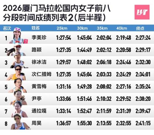本场比赛最大的看点之一要属最终拿下厦马国内女子冠军的李美珍,2:27:24的成绩比去年她在无锡马拉松跑出的PB成绩还快了27秒。此外,鲁蒂·阿加以2:22:45斩获女子冠军,达维特·沃尔德以2:09:18夺得男子冠军,杨绍辉拿下国内男子冠军。有趣的是,这三人正好也是去年厦门马拉松的冠军。